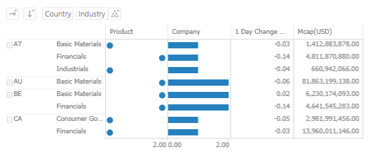 Country, Industry, Product, and Company are text columns while 1 Day Change % (USD) and Mcap(USD) are numeric columns.