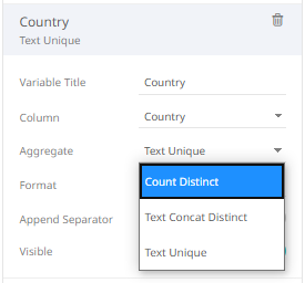Creates numeric aggregated variables based on the distinct count of text columns.
