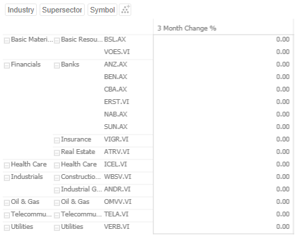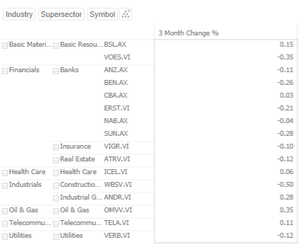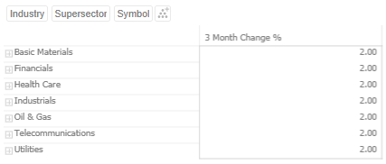 This Table visualization is showing the grouping of the columns based on the breakdown hierarchy with 3 Month Change %’s aggregate set to Sum.