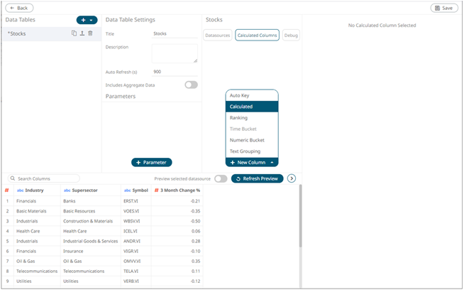 1. On the Edit Data Table layout page, click Calculated Columns and select Calculated.