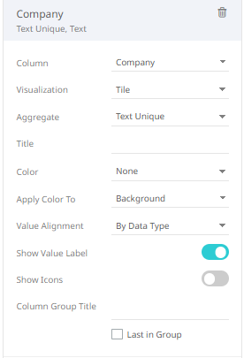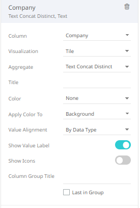 If the aggregate for the Company column is changed to TextConcatDistinct, all of the text values for the corresponding breakdown columns are displayed in a comma delimited list: