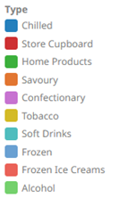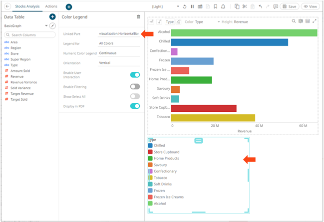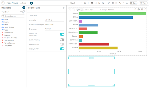 The Color Legend displays the color variables of the associated visualization. You can also set the orientation and style or enable the ability to do a filter or to display this part in the PDF output.