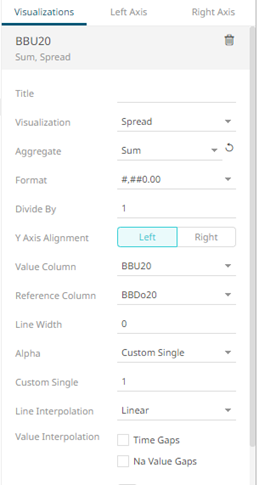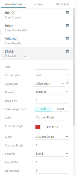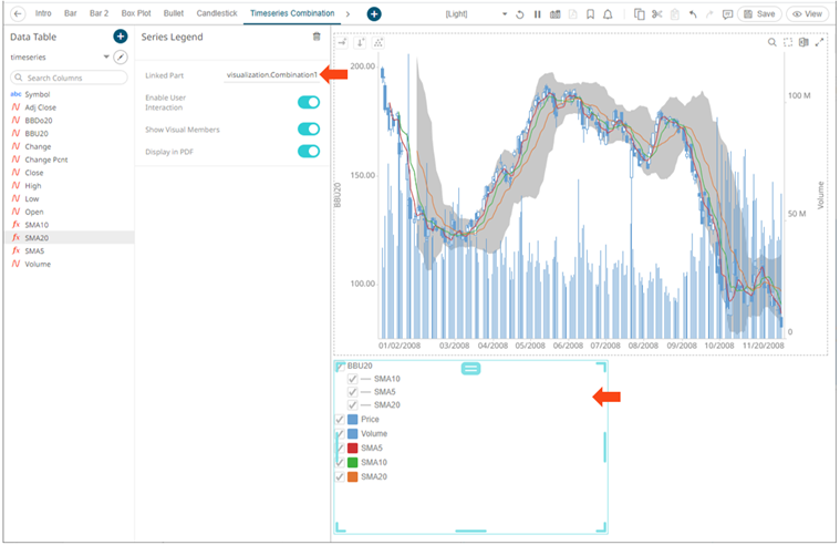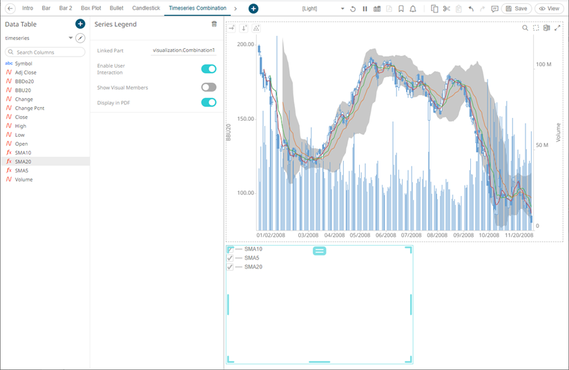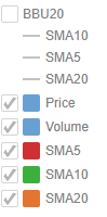 Setting the Custom Single color for the visual members helps display the Color Legend for layers in the Combination Graph, in cases where the Color variable is not used. Furthermore, the SMA10, SMA5, and SMA20 are the reference lines added under the BBU20 visual member.