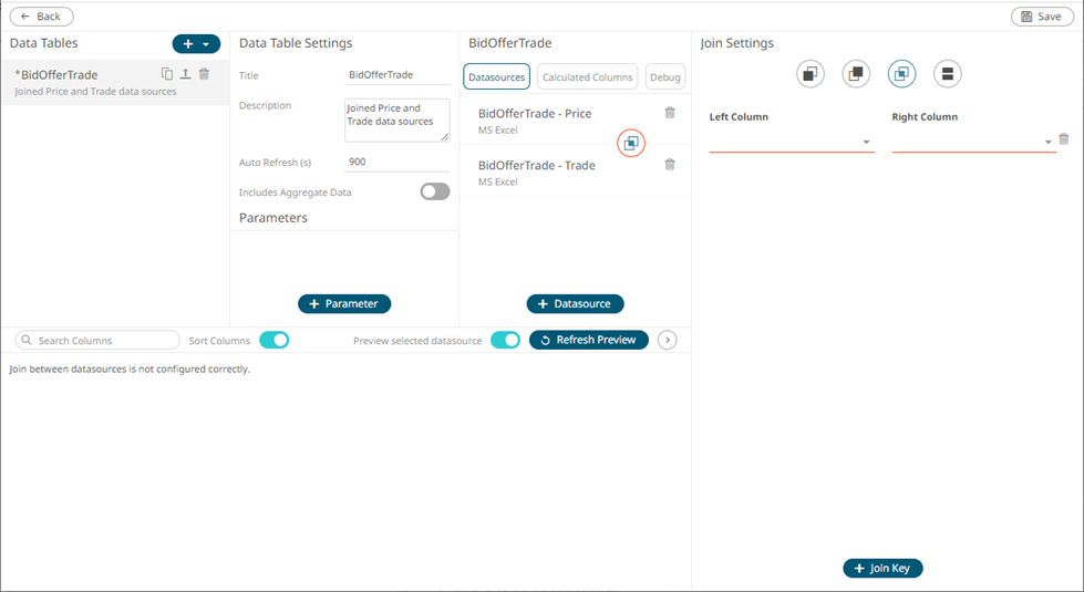 To join multiple tables, add the source tables in the Edit Data Table screen and join them using a common field or a join key. Furthermore, you can also perform a transform of a table for time series analysis, if required.