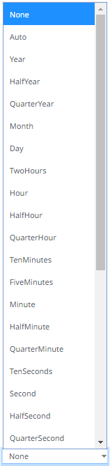 Year, Half Year, Quarter Year, Month, Day, 2 Hours, Hour, Half Hour, Quarter Hour, 10 Minute, 5 Minute, Minute, Half Minute, Quarter minute, 10 Seconds, Second, Half Second, Quarter Second, Tenth Second, Fifty Milliseconds, 10 Milliseconds, 5 Milliseconds, Millisecond, 50 Microseconds, 10 Microseconds, 5 Microseconds, Microsecond, 50 Nanoseconds, 10 Nanoseconds, 5 Nanoseconds, Nanosecond.