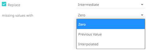 The interpolation can replace missing numeric values with Zero, the Previous Value, or an interpolation between known values (Interpolated).