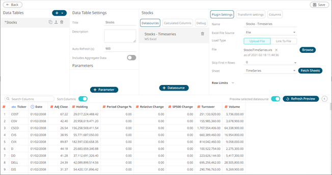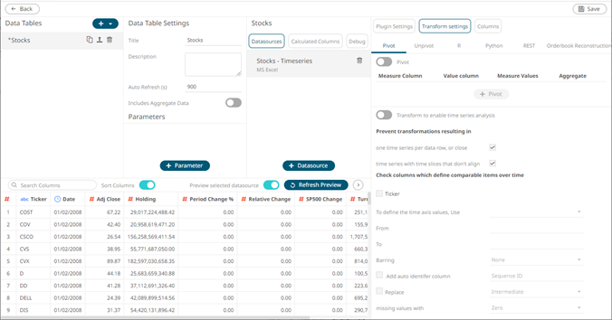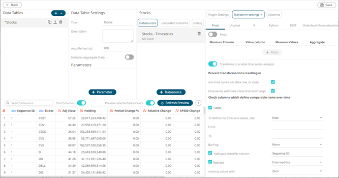 Your source data must be transformed in order to use time series visualization. The transform converts the dataset into a cube, where the Z axis of the cube represents time, providing a set of time slices to play through and calculate across.
