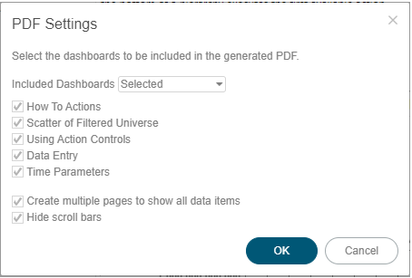 Select the dashboards to be included in the generated PDF.