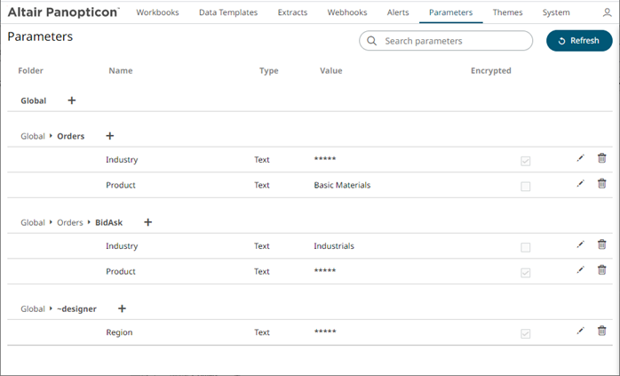 Users with an Administrator or Designer role can add, modify or delete global parameters that will pull and enter specific data into the different sets that are assigned to workbook folders, as well as user specific folders for Designers (e.g., Global > Orders, Global > Orders > BidAsk, Global > ~designer).
