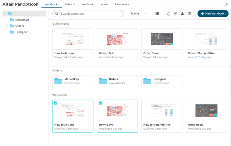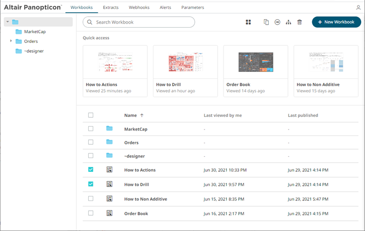 1. Check the box of one or multiple workbooks either:
