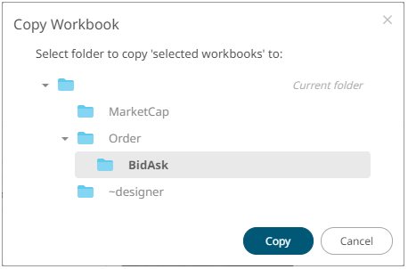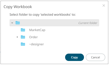 The Copy Workbook dialog displays with the folder or subfolders the user is allowed to copy the workbooks to.