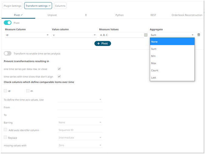 When applying a pivot transform, you can select Sum, Min, Max, Count, or Last aggregation method.