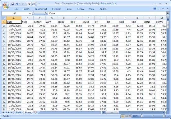 Where the first column represents the Date/Time, and subsequent columns represent the same variable such as Price for a given item. In the MS Excel screen shot above, the price history for a series of stocks are displayed.