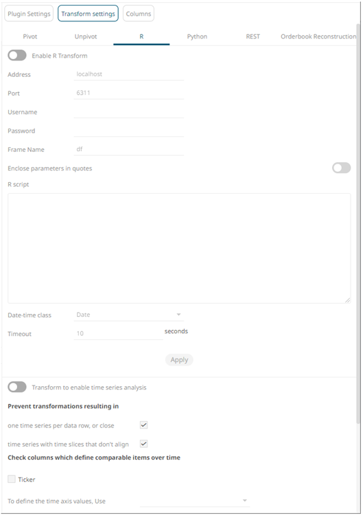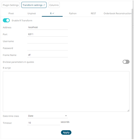 · When used with streaming data sources (e.g., message bus), the Real Time Limit of a streaming data source should be set to a value longer than the time taken to perform the R data transform. For example, if the transform operation takes 2 seconds, the Real Time Limit should be set to 2500 milliseconds. · When used for non-streaming data sources (e.g., Database), the data table Auto Refresh period should be set to a value longer than the time taken to perform the R data transform. For example, if the transform operation takes 2 seconds, the data table Auto Refresh period should be set to 3 seconds.