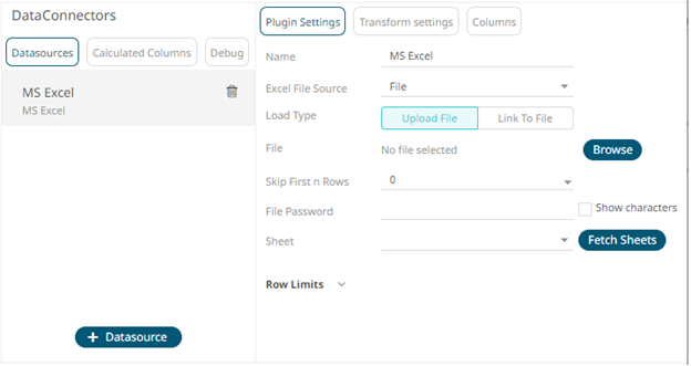 1. Select MS Excel from the Data Sources pane. The MS Excel Settings pane and the retrieved MS Excel source are displayed.