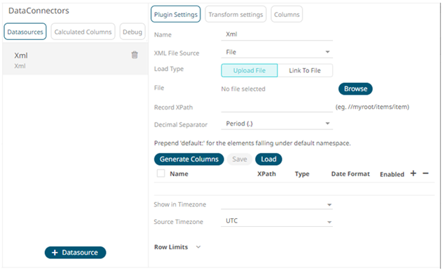 1.     Select XML from the Data Sources pane. The XML Settings pane and the retrieved XML source are displayed.