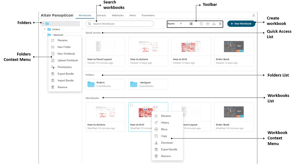 Allows renaming, viewing history and republishing, moving, copying, downloading, exporting bundles, and removing workbooks. |