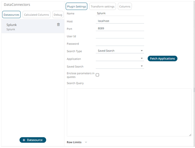 1. Select Splunk from the Data Sources pane. The Splunk Settings pane and the retrieved Splunk source are displayed.
