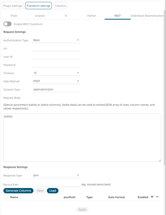 A REST Transform can be used when you have access to a REST API that accepts a POST or PUT request, containing data in a JSON-formatted request body. The API is expected to apply a specific transform or calculation on the data and returns the resulting data set. Typically, any REST API used this way is created and made available by your own organization, since the owner of the REST API will be able to monitor any data handed to it. Using a REST Transform is an alternative to using a Python Transform or R Transform. There are various cloud services that facilitate the task of exposing your code as a REST API.
