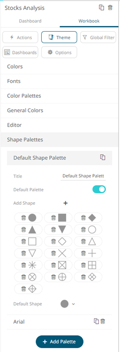 Shape palettes that can be used with the workbook theme can be created, modified, duplicated, or deleted on the Shape Palettes section of the Theme Settings pane.