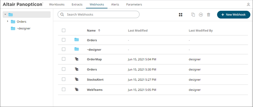Sorting webhooks can be done by Name, Last Modified, or Last Modified By.