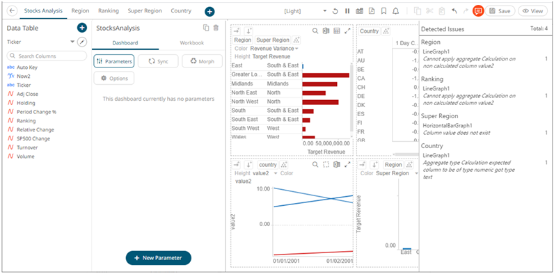 Panopticon Web Authoring allows you to view and fix workbook detected issues, primarily data related settings such as column names.