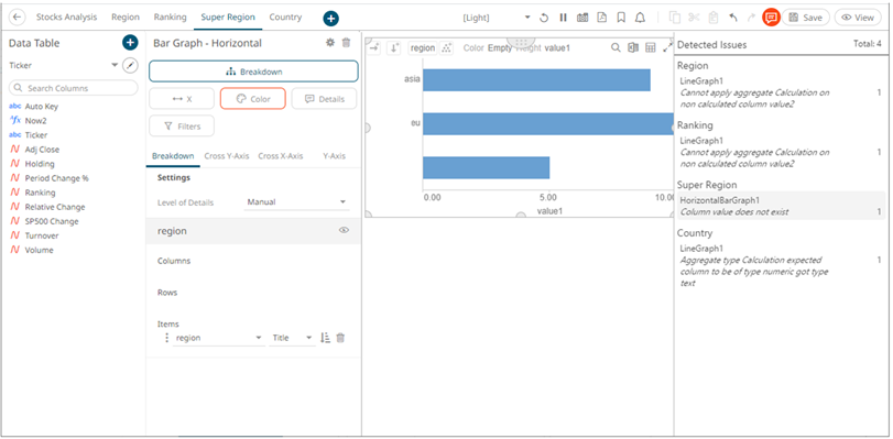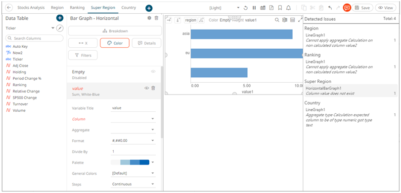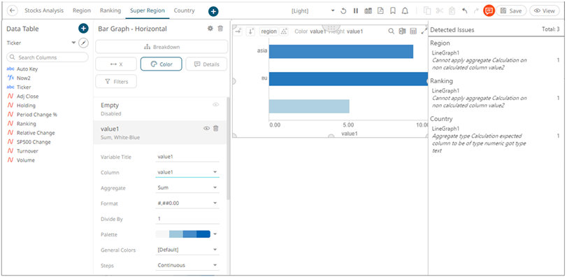 Panopticon validates the Reference Lines variable column against the master variable aggregate. An error is reported if the aggregate is calculated and the Reference Lines is not (e.g., first and second issues “Cannot apply aggregate Calculation on non calculated column <value>”).
