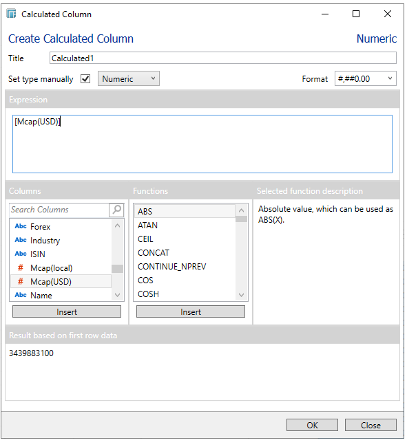 Double-click or click Insert. The selected column is displayed in the Expression box and the value in the Result based on the first row data box.