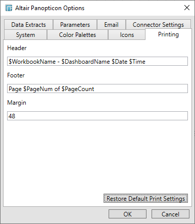 1. Select the Printing tab to define the output style of printed workbook dashboards, including Header, Footer, and Margin.