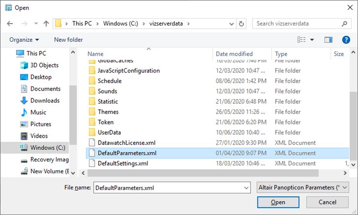 Select the DefaultParameters.xml file located in the App_Data folder (e.g., c:\vizserverdata) in the Open dialog box.