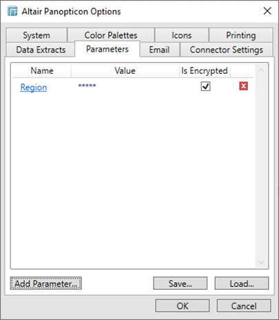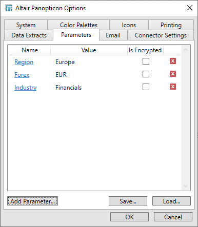 The DefaultParameters.xml file that controls the global parameters for the Panopticon Visualization Server can now be easily loaded in the Panopticon Designer (Desktop) by clicking Load.