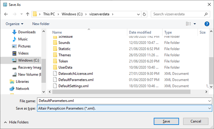 To save the default parameters (DefaultParameters.xml fie), click Save. Locate the App_Data (e.g., c:\vizserverdata) folder in the Save As dialog.