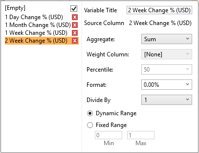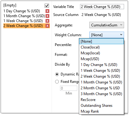 If you set the aggregation method to Cumulative Sum, Cumulative Sum By Max, Ratio, Percent of Weight Parent, Percent Weight of Total, Weighted Harmonic Mean, Weighted Mean, or Weighted Sum, the Weight Column drop-down list is enabled that allows you to select the weight column to be used.