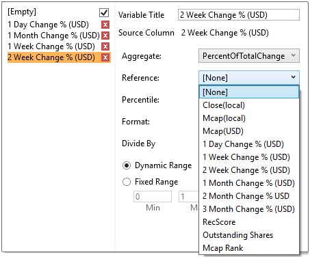 If you set the aggregation method to Percent of Total Change, the Reference is enabled that allows you to select a reference column to use.
