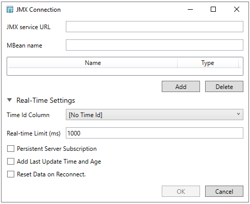 When creating a new data table, select JMX from the Connect to data dialog. The JMX Connection dialog is displayed.