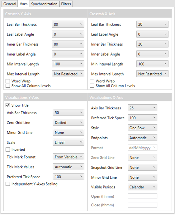 Refer to Visualizations Axes, Cross Tab Axes, and Time Axes for more information.