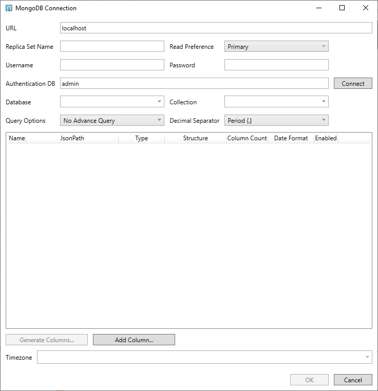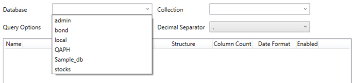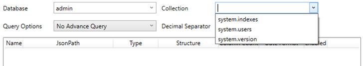 However, if you do not have access to the Admin database, you can manually enter a Database name and click Connect. Then select a Collection in the populated drop-down list box.