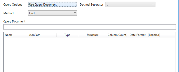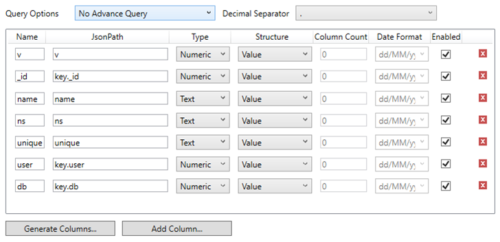 NOTE: It is recommended to name the column the same as its JSON path for clarity and uniformity. The Structure and Column Count fields are used for more advanced features and are covered in the Row-Wise Array Expansion, Column-Wise Array Expansion, and Bson-Wise Array Expansion sections. Value is the default structure and will always display data regardless of actual structure.