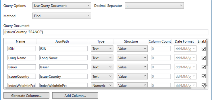 Click the Generate Columns button. This will query MongoDB for the first few records and attempt to build your table schema from that information.