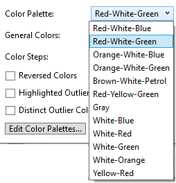 The numeric color palettes available in this drop-down are defined in the Color Palettes tab of the Altair Panopticon Options dialog and enabled in the Color Palettes tab of the Workbook Theme dialog.
