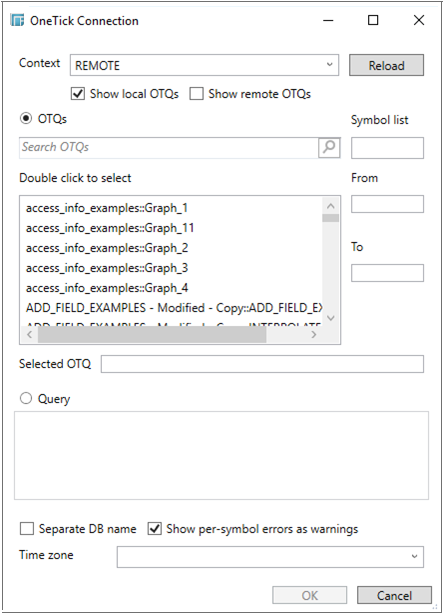 The OneTick connector allows connection to OneMarketData OneTick tick history databases on a polled basis. In general, it is used to retrieve conflated time series data sets. The connector supports either: