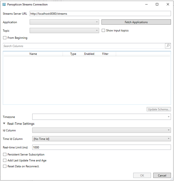 When creating a new data table, select Panopticon Streams from the Connect to data dialog. The Panopticon Streams Connection dialog displays.