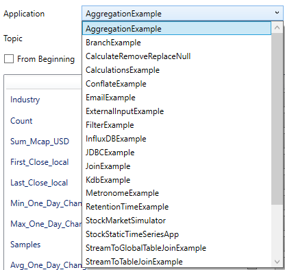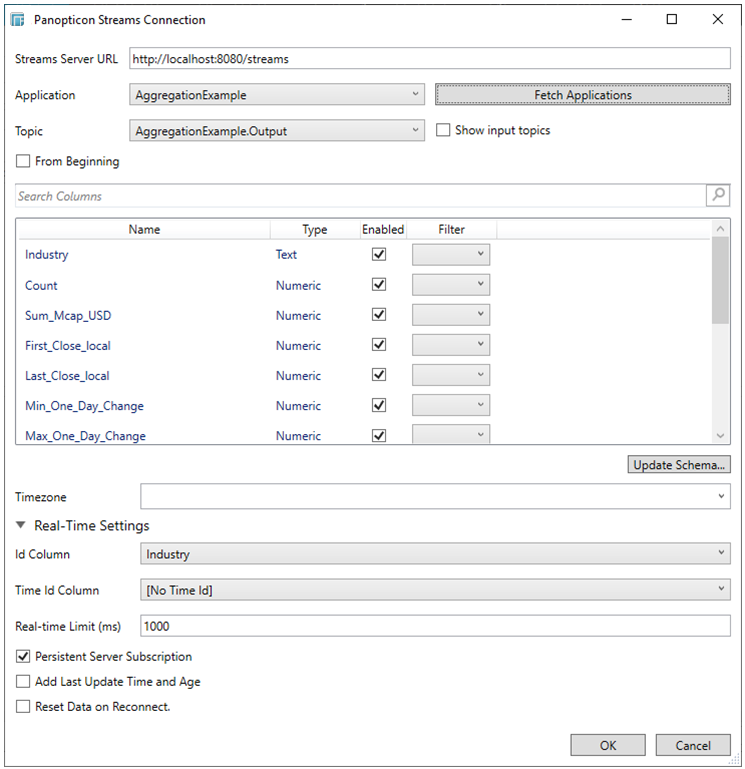 Click Fetch Applications. The first application in the Application drop-down list is selected and the schema of the output topic is displayed, if it is started in the Panopticon Streams server.