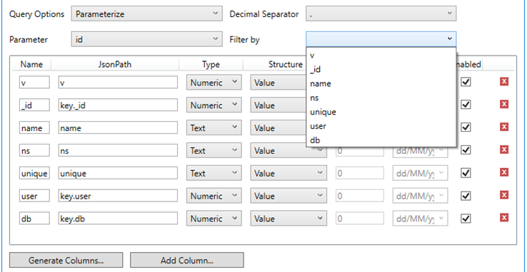 The Parameterize option under Query Options allows for a specific, single field, filter. The main advantage to the Parameterize feature is that, unlike the using a Query Document, it can take a parameter that contains an ObjectId string and correctly filter on it.