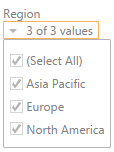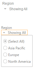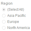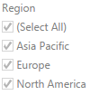 Only a single item or all items may be selected. When collapsed, it shows the summary text or the single selected item. For the example below, the region selected is Europe.