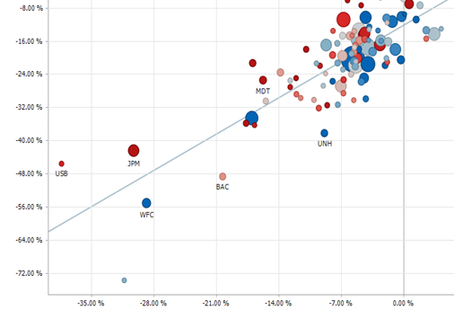 Panopticon Designer (Desktop)'s Scatter Plot data visualizations are easy to set up and highly customizable. You can configure your display in ways that will make the most sense to you and your users, and users have all the tools they need to filter and manipulate the Scatter Plot to concentrate on the most relevant subsets in the data.