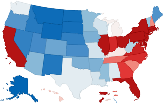 Unlike the Geographic Scatter Plot, the size of each shape is fixed, imparting the importance of the item. As a consequence, data should be relative to each shape size, such as area densities.