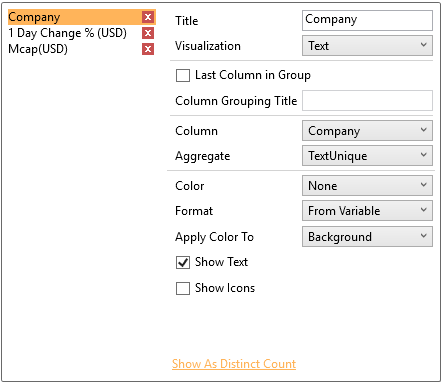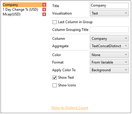 If the aggregate for the Company column is changed to TextConcatDistinct, all of the text values for the corresponding breakdown columns are displayed in a comma delimited list: