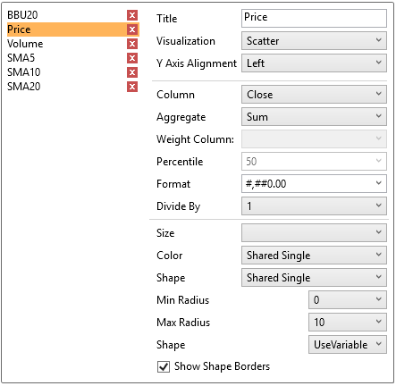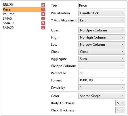 The Timeseries Combination visualization operates in a similar way to the Table. Instead of multiple input variables becoming different columns in a table, they become different layers in the time series combination visualization. Therefore, unlike other visualizations, it can display a large number of time series variables, which can be rendered as: Line, Candle Stick, Needle, OHLC, Spread, Stack & Stacked Needle.