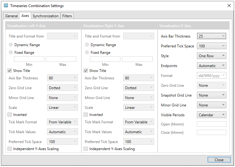 For the Timeseries Combination visualization, this includes an expanded Axes panel, which includes specification of the properties of both the Left and Right Y Axes.